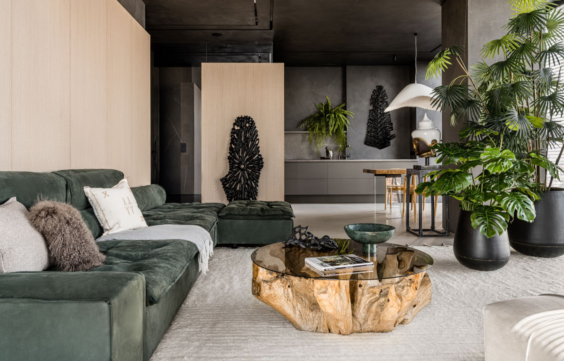 В кухне-гостиной нейтральная цветовая палитра подчеркивает аутентичность интерьера и объединяет природные мотивы с современными формами. Стол из цельного спила дерева, роскошные растительные композиции и нарочито несовершенные детали декора уравновешиваются строгими линиями кухонного гарнитура и четкой геометрией стен.