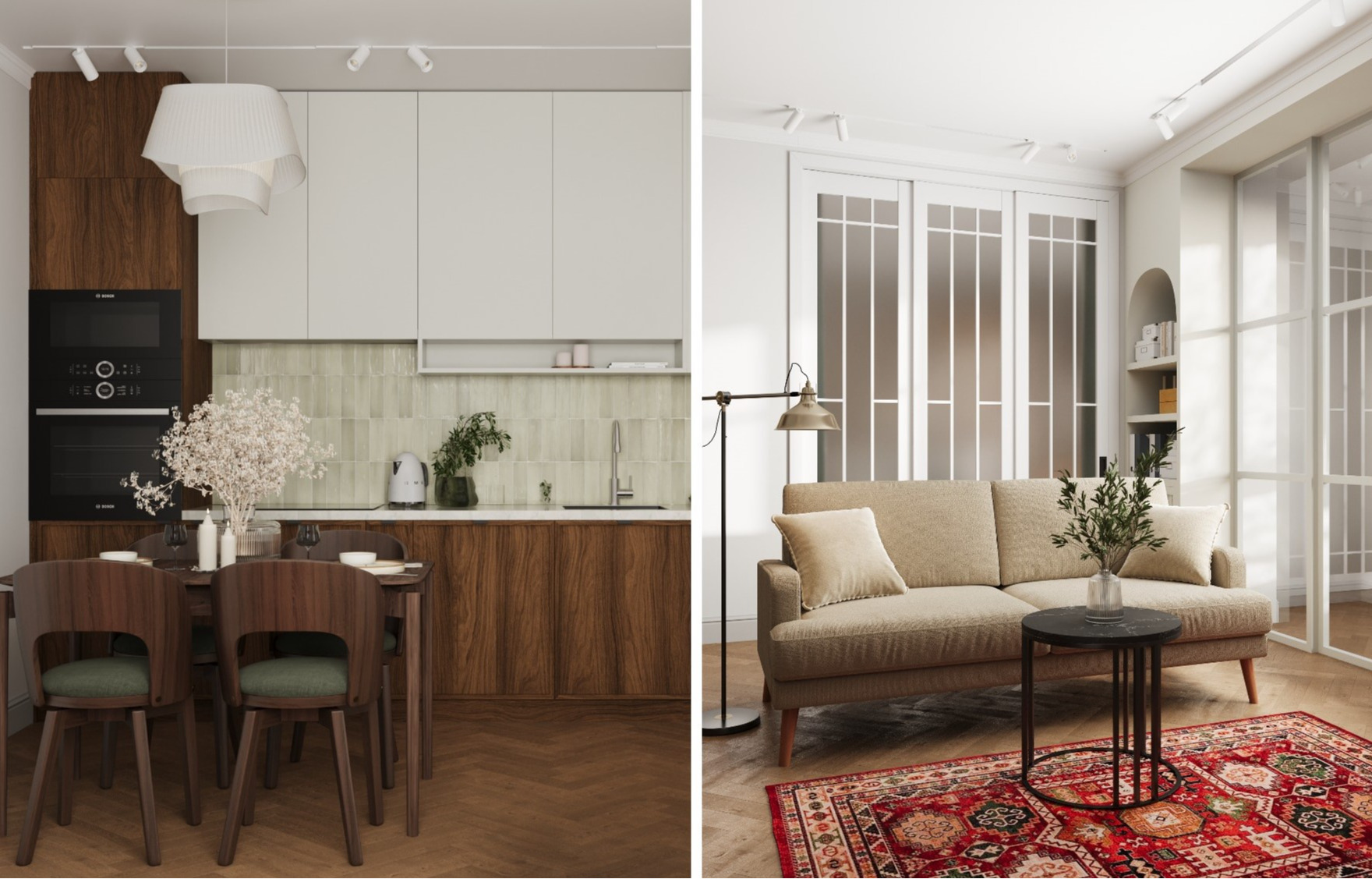 Дизайнеры Анна Лаковская и Гера Остин из студии ITEMS Bureau разработали проект для молодой семьи с маленькой дочерью. Глава семьи работает в сфере IT, а его супруга — искусствовед. Заказчики выразили пожелание создать светлый интерьер, своеобразный «фон» для их коллекции картин и предметов искусства. Также было важно использовать натуральные материалы и добавить акцентные цвета.