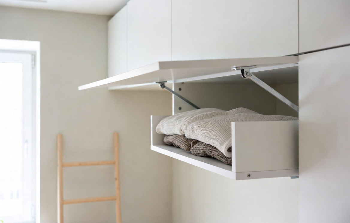- Тяжелые распашные дверцы. Открывать их, стоя на стремянке, неудобно и опасно. Лучше: подъемные фасады с доводчиками или раздвижные панели.