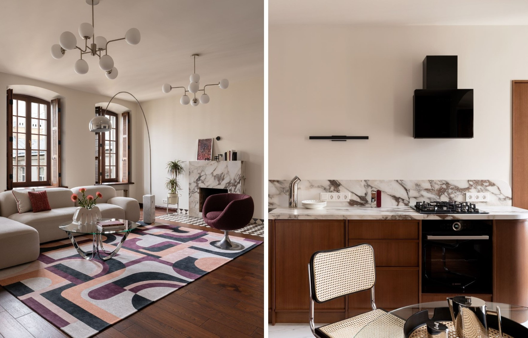 Планировка квартиры осталась прежней, но в нее деликатно вплели современные акценты. Цветовая палитра, выбранная в соответствии с предпочтениями хозяйки, включает приглушенные тона, напоминающие вечерний свет: охра, терракота, бордо и винные оттенки. В отделке использованы исключительно натуральные материалы с выразительной текстурой, словно хранящей отпечатки времени. Все элементы интерьера, гармонично сочетаясь друг с другом, создают мягкую и глубокую мелодию, подобную звучанию старой пластинки, где каждый шорох усиливает очарование композиции.
