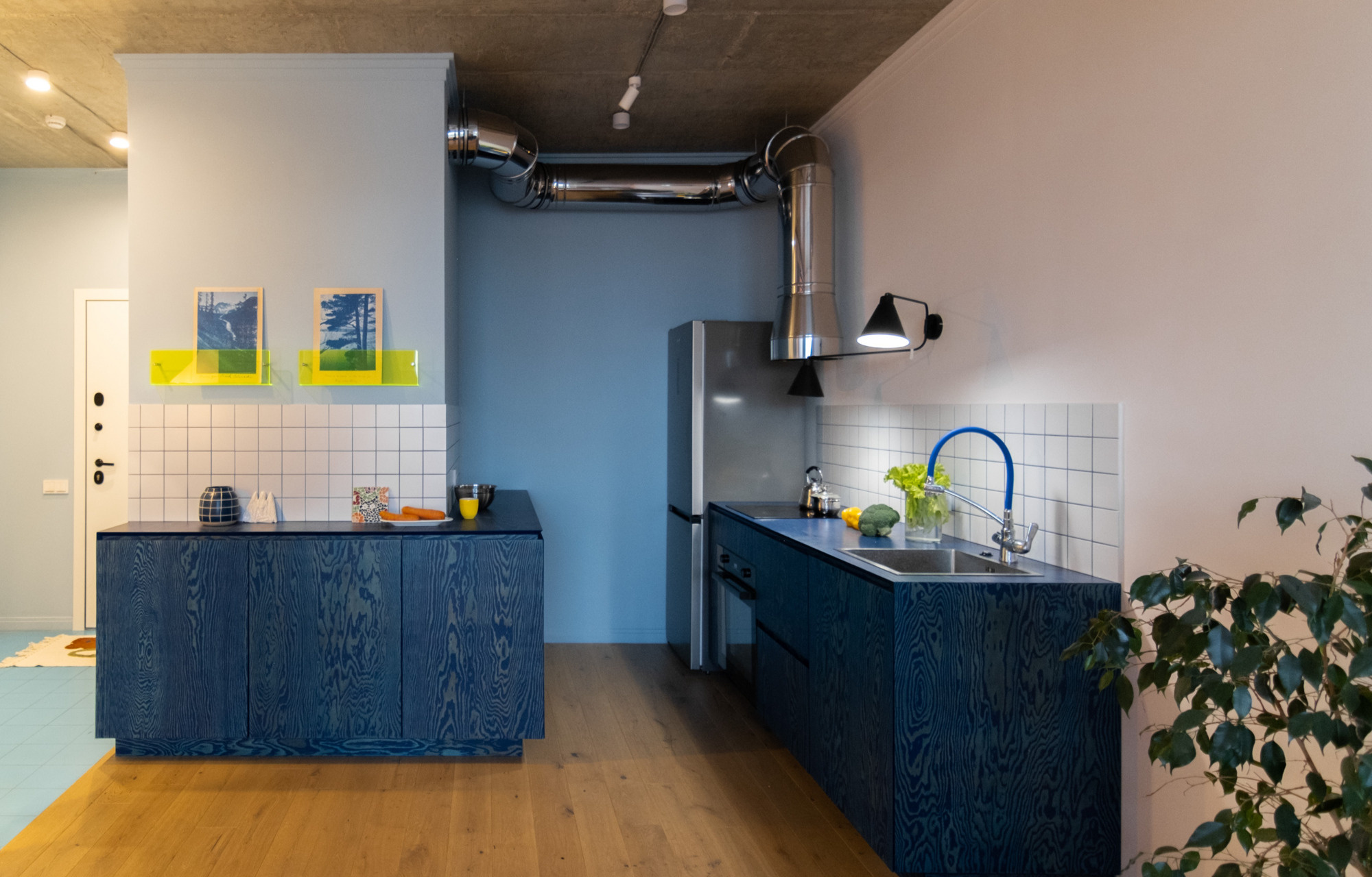 Кухня спроектирована с использованием типовых размеров модулей, где это возможно. Все хранение и техника располагаются в нижних закрытых шкафах. Фасады и корпуса изготовлены из лиственничной фанеры, окрашенной в синюю морилку и покрытой толстым и прочным матовым лаком. Все фасады и детали кухни, включая столешницу, запилены под углом 45 градусов, что позволяет скрыть торцы фасадов и корпуса, в результате чего кухня выглядит как единая целостная фигура.