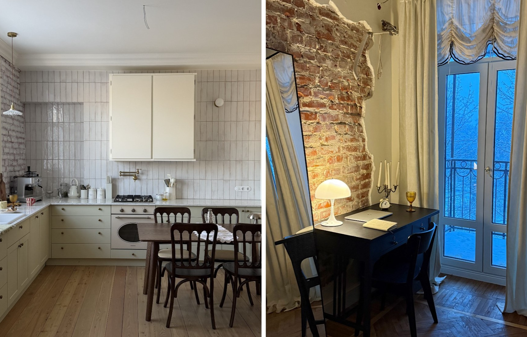 Я самостоятельно работала с кирпичными стенами: использовала перфоратор и болгарку с металлической щеткой, чтобы в несколько этапов зачистить старую штукатурку, затем наносила новую на швы и снова очищала. В итоге в каждой комнате кирпич получился разным — где-то я его покрасила, где-то покрыла лаком. Главной целью было продемонстрировать красоту старых кирпичных стен, сделав их центром притяжения в каждом помещении.