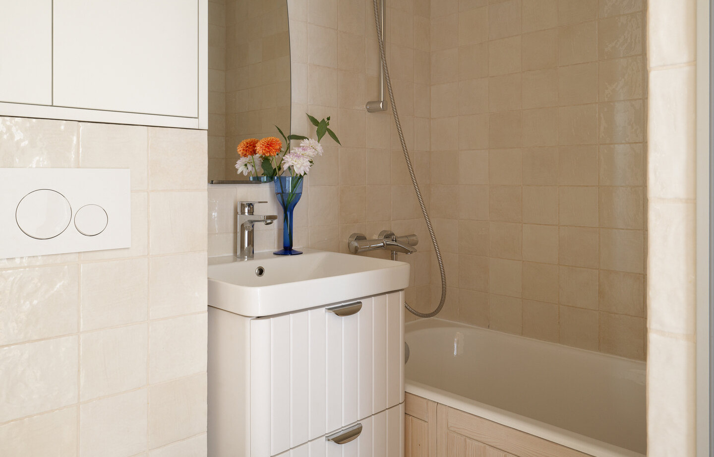 Стандартная ванна 170 см занимает больше половины площади санузла. Ванна 150 или 140 см дает тот же комфорт при меньших размерах.
