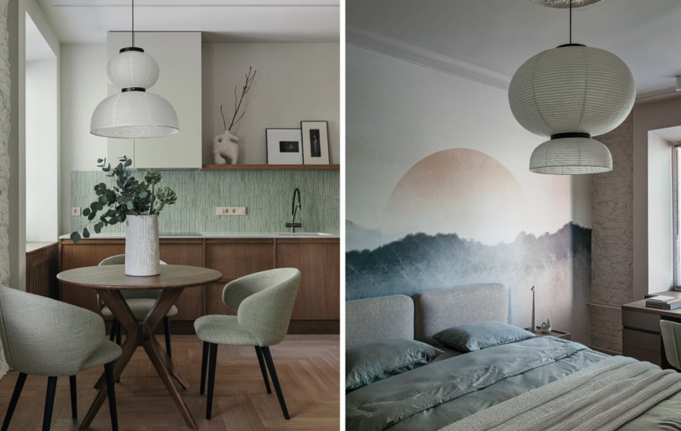 Окна квартиры выходят в тихий, зеленый двор, и эта близость к природе нашла отражение в интерьере. Природные оттенки — сдержанные, натуральные зеленые, селадоновые, молочные и терракотовые — проникают в каждую комнату, создавая ощущение гармонии между внутренним и внешним миром.