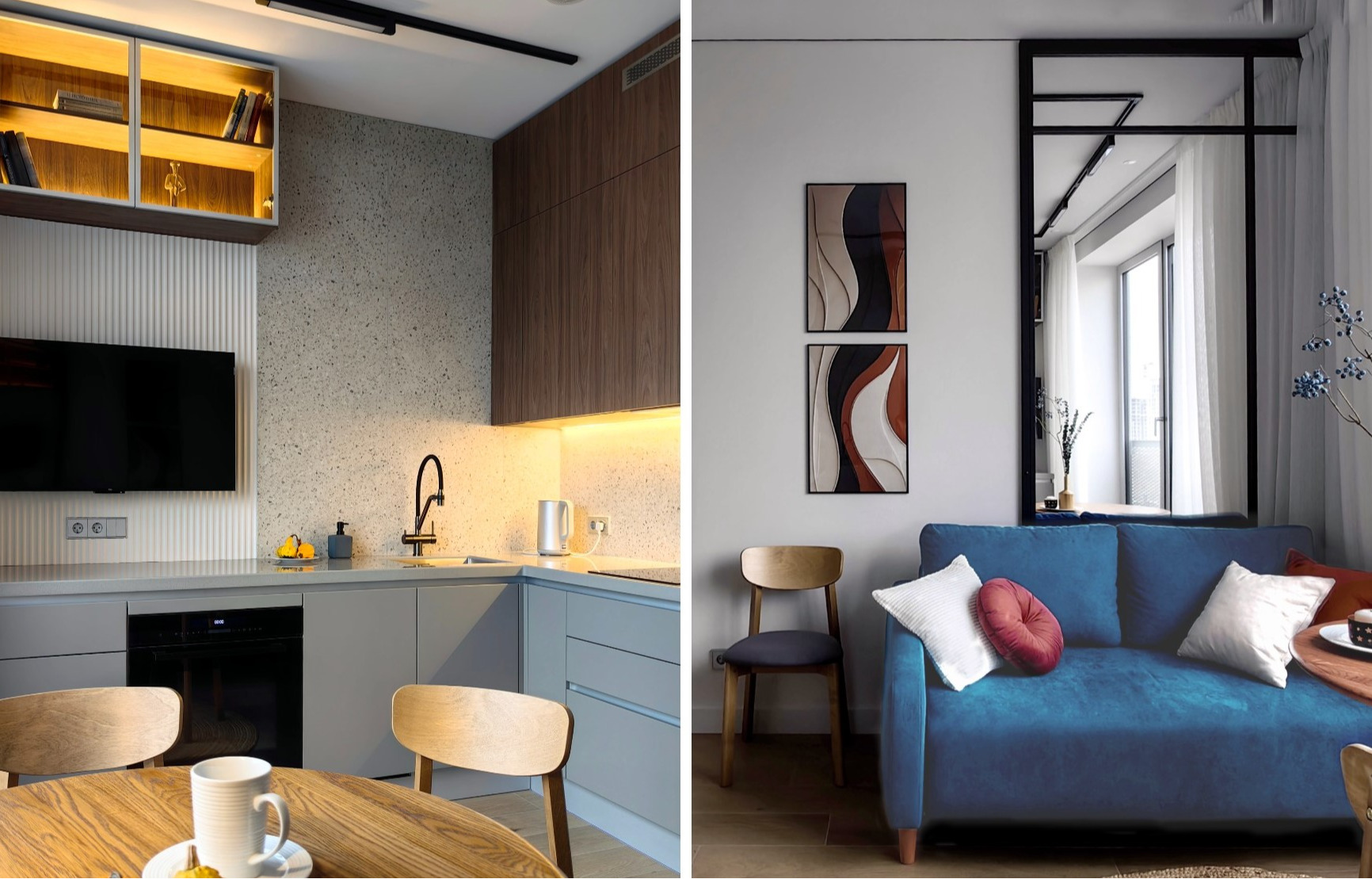 Стены в комнатах окрашены, а фартук кухни и стены в санузле облицованы керамогранитом. На полу в общей зоне и санузле уложен керамогранит, в спальне — инженерная доска. В зоне ТВ на кухне стены декорированы рельефными панелями. Их смонтировали после установки натяжного потолка для создания идеального примыкания, а затем выкрасили в цвет стен.