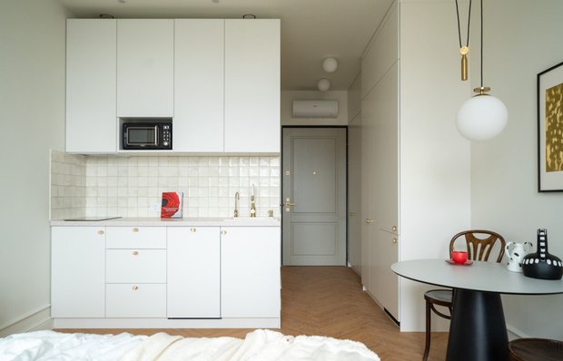 — В этой студии мы стремились максимально эффективно использовать каждый сантиметр. На 25 квадратах разместили ванную комнату, вместительную систему хранения, кухню, зону отдыха и спальное место. Создать атмосферу уюта помог выбранный стиль — французский шик, придающий интерьеру элегантность и изысканность.