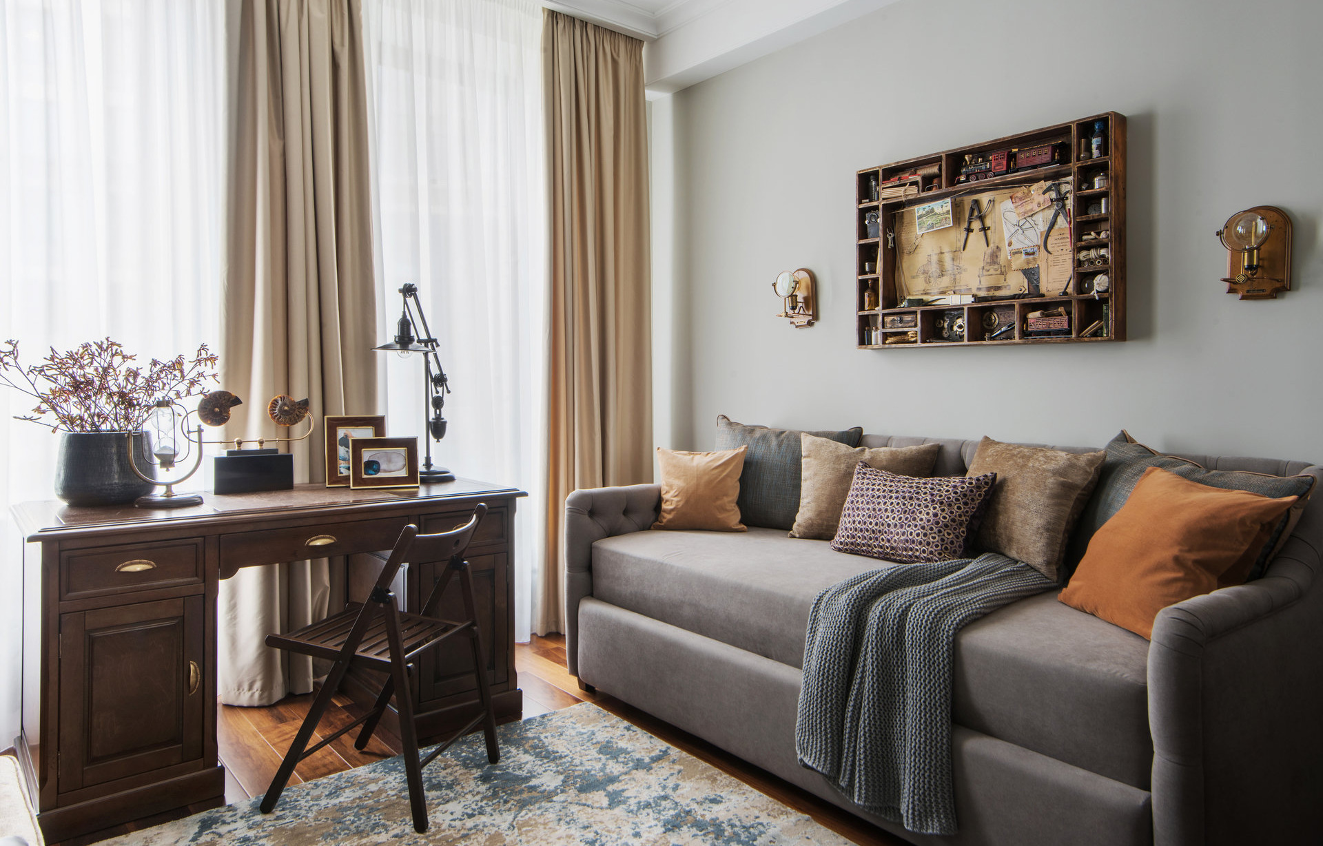 Решение: компенсировать недостаток света с помощью искусственного освещения. Причем не одной люстры в центре потолка, а нескольких источников на разных уровнях. Температура ламп должна быть теплой, от 2700 до 3000 кельвинов.