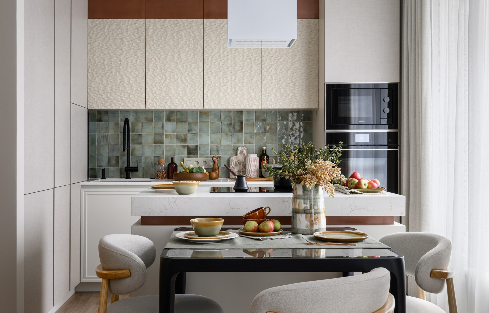 Гостиная, совмещенная с кухней, оформлена в цветах меди и бирюзы. Небольшая обеденная группа на двоих гармонично вписывается в пространство, создавая атмосферу уюта и комфорта для семейных ужинов. Центральным элементом кухни стал остров, в который интегрирована варочная панель. С одной стороны острова предусмотрены места для хранения, что позволяет эффективно организовать пространство и поддерживать порядок.