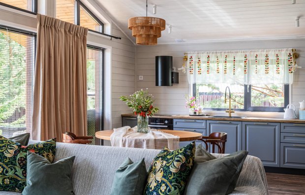 Хоумстейджер Василина Серебрякова из бюро «Бахрома» разработала интерьер для семейного загородного дома, в котором живут родители и трое детей. Дом предназначен для сезонного отдыха и главным запросом стало создание пространства, свободного от суеты, которое живет в ритме отдыха и общения. Это место, где неспешно собираются все вместе за просмотром фильма, лепят пельмени на большой кухне, пьют чай с собственным вареньем, принимают гостей в уютной гостиной или, когда нужно, уединяются для тихого отдыха.