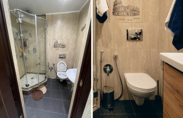 В санузле тоже не стали менять основу — просто обновили сантехнику, добавили новую раковину, тумбу, зеркало и темно-синий потолочный плинтус, чтобы связать пространство с общим стилем квартиры. Это позволило заметно сократить расходы и сроки. Стены облицованы бежевой плиткой под травертин с легкой текстурой камня — нейтральный фон, который не перегружает крошечное пространство.