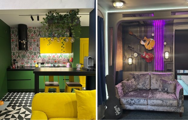 Кабинет, выполненный в стилистике подводной лодки, воплотил давнюю мечту хозяина дома о собственном убежище — пространстве, где можно укрыться от повседневных забот и полностью погрузиться в творчество. Поскольку его главное увлечение — музыка, в помещении нашлось место для инструментов и рабочего стола, оснащенного всем необходимым. Для отдыха здесь же разместили диван в мягком лиловом оттенке.