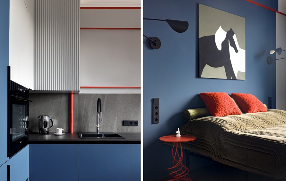 Стены и потолок окрашены в несколько насыщенных цветов. Основным нейтральным фоном выступил серый. Его дополнили глубокий синий и яркий красный — оттенки, которые не просто оживляют пространство, а архитектурно подчеркивают необычную геометрию комнат.