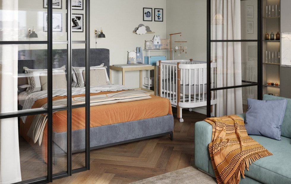 Ребенку в однушке нужно свое место, даже если это всего полтора квадратных метра. Оптимальная схема: кроватка плюс пеленальный столик плюс комод. Звучит громоздко, но современная мебель умеет совмещать функции.