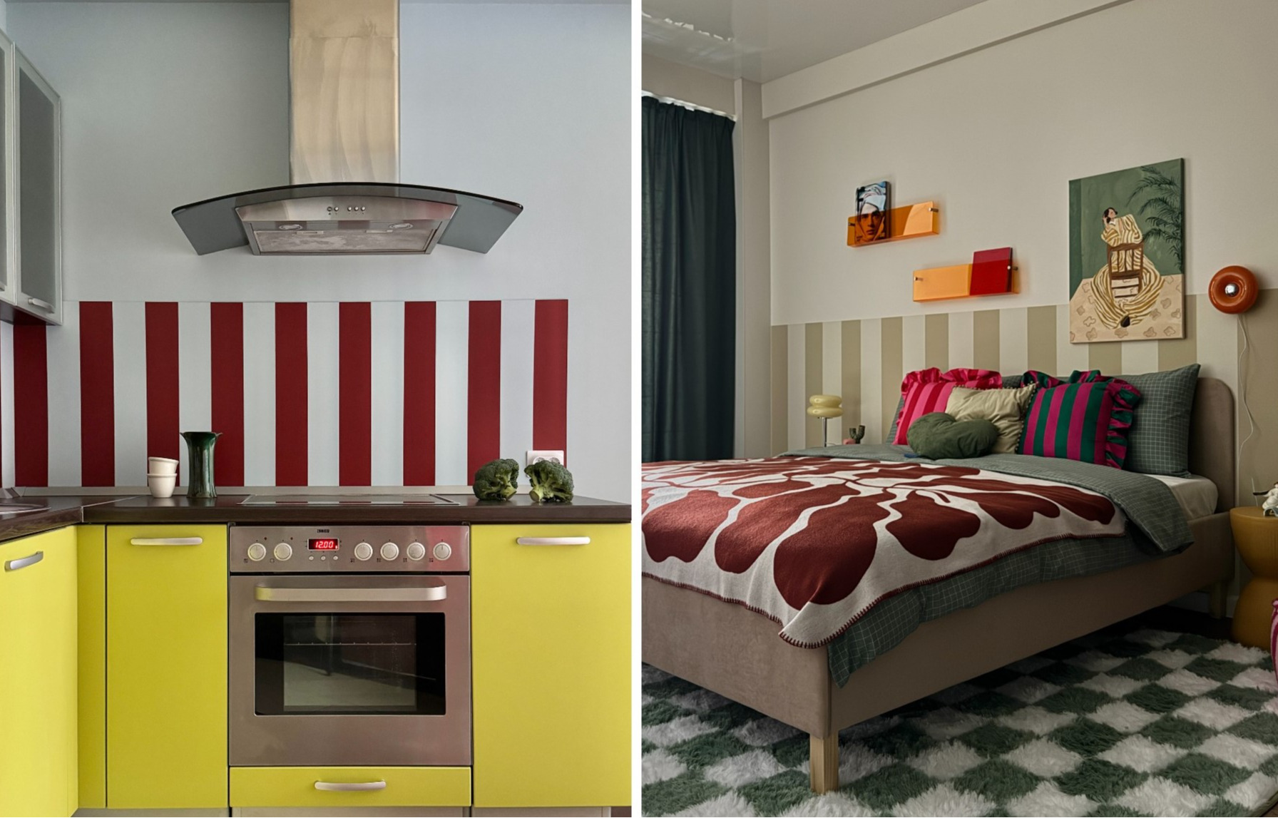 Прием: Стены и фартук перекрасили, что изменило общее восприятие пространства. Цвет стал ключевым элементом, добавившим свежести и современности. Стены дополнительно украсили постерами.