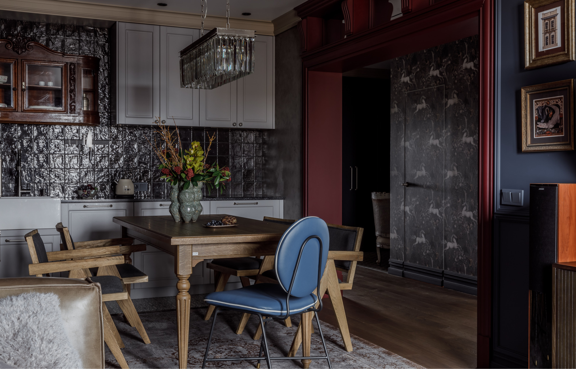 Обеденный стол, изготовленный по индивидуальному заказу, стал акцентом столовой зоны. Он красиво контрастирует с кухонными пеналами глубокого винного оттенка, который также использован для оформления проема. Композицию дополняют хрустальная люстра и бельгийский ковер с приглушенным винтажным рисунком.