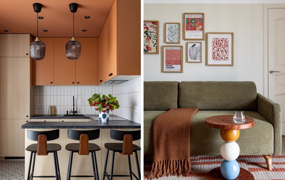 Для базовой отделки все стены и потолки были оштукатурены и окрашены износостойкой краской (в санузле — специальной, для влажных помещений). Напольные покрытия подобраны с учетом функционала каждой зоны: в прихожей и на кухне уложена практичная керамическая плитка, в жилых комнатах — теплое и влагостойкое кварцвиниловое покрытие в раскладке «английская елка», а в ванной — прочный керамогранит. Акцентной отделкой стала мелкоформатная плитка, которой облицевали зону ванны и кухонный фартук. Ее визуальный эффект усилен яркой контрастной затиркой в тон стенам.