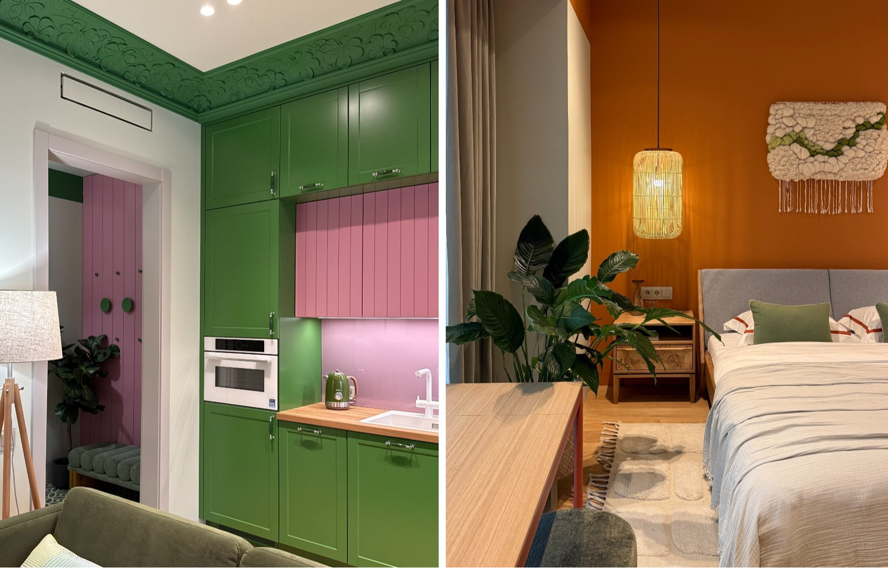 Кухонную зону оформили в комбинации зеленого и нежного розового цветов, которую дополняет белоснежная встроенная техника. Такое сочетание создает ощущение свежести, чистоты и легкости, гармонично связывая кухню с общей стилистикой пространства. За фасадами кухонного гарнитура скрыто функциональное хранение, а также встроены холодильник и посудомоечная машина.