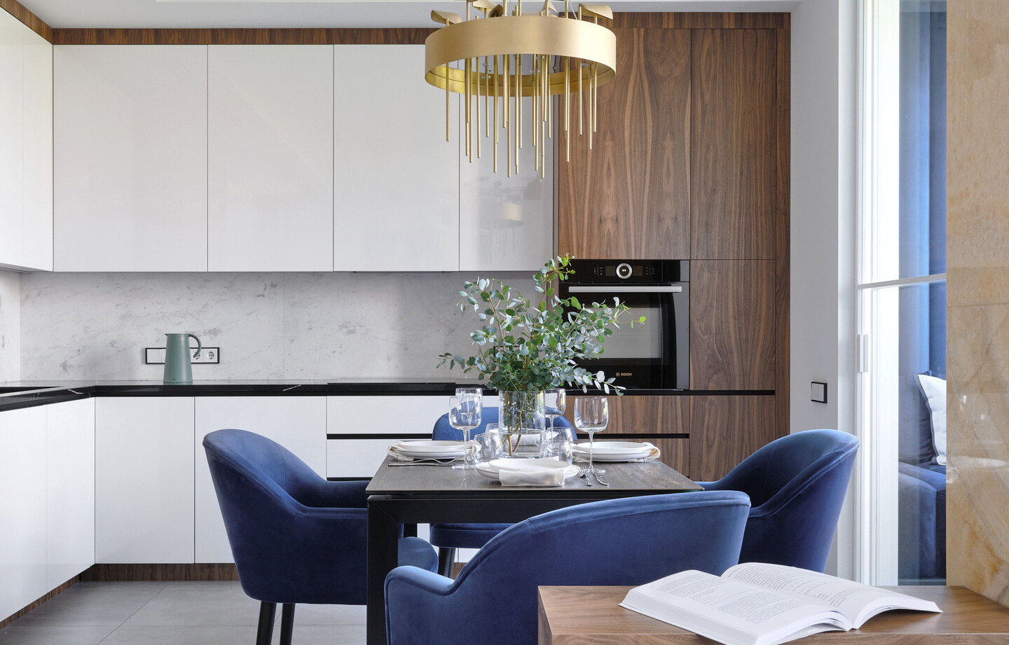 Три материала, которые стоит рассмотреть для кухни прямо сейчас: травертин для фартука, крашеный металл для фасадов и деревянная столешница с масляным покрытием. Эта комбинация будет выглядеть актуально и через пять лет, чего про белый мрамор уже не скажешь.