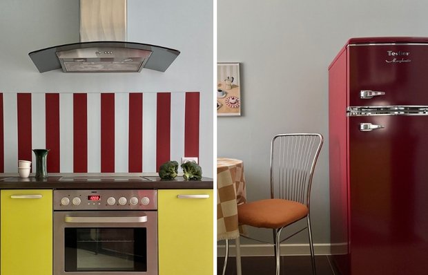 Главный ход здесь фартук: вместо плитки или стеклянной панели стену за варочной просто перекрасили в жирную бордово-красную полоску на голубовато-серых стенах. Это дешевле любой отделки и смотрится как полноценный арт-объект. Полоска крупная, вертикальная — визуально тянет потолок вверх, что при высоте 2,6 м совсем не лишнее.