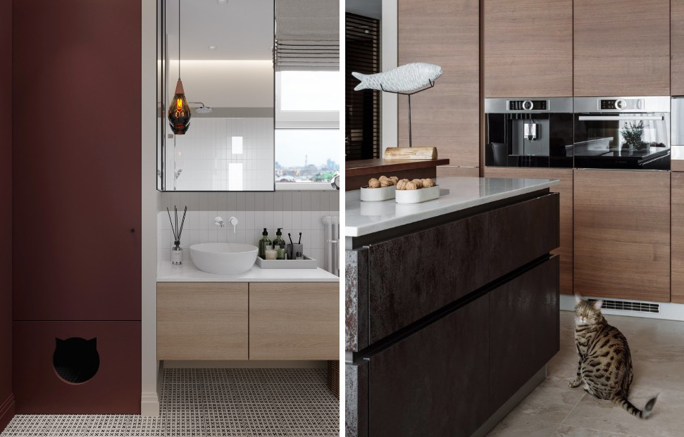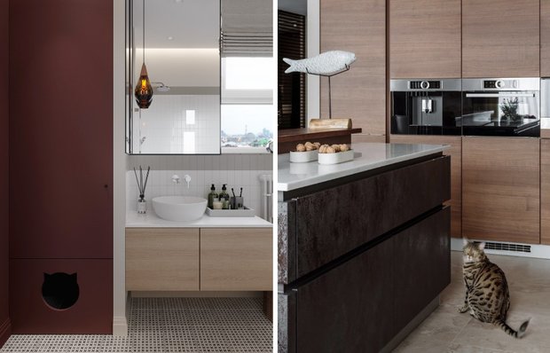 Дизайнер Ольга Литковская создавала интерьер для семьи с ребенком и кошкой, которые хотели спокойное пространство с утонченными акцентами. Лоток для кошки спрятали в высоком шкафу напротив унитаза: нижняя часть с распашными фасадами отведена под зону для питомца, выше — система хранения, под самым потолком — водонагреватель. В фасаде шкафа предусмотрено отверстие для прохода кошки в форме кошачьей головы.