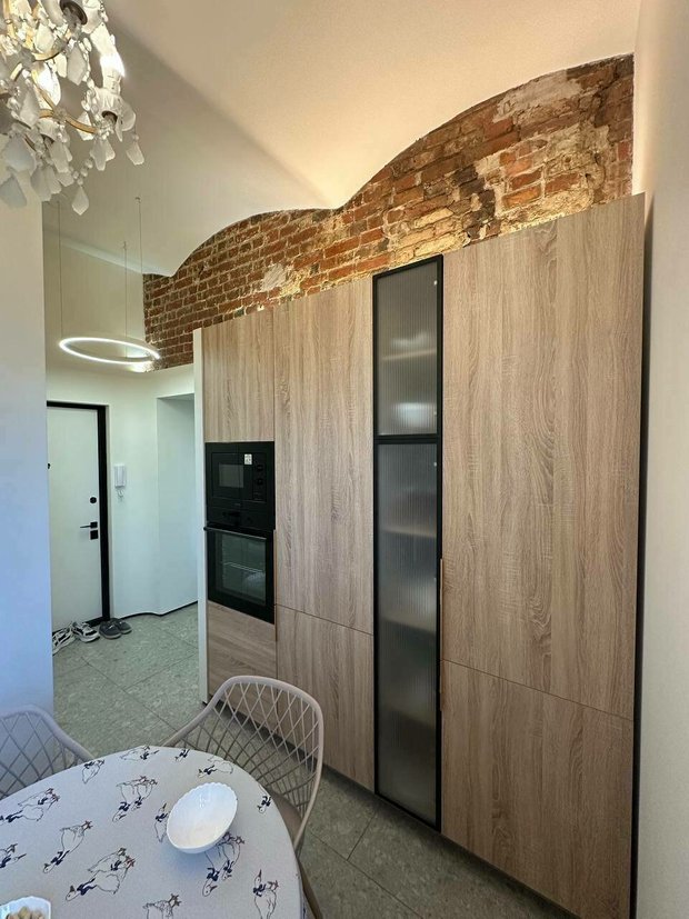 Прием позволяет полностью скрыть зону для питомца от глаз, сохранив эстетику кухни и прихожей. Снаружи пенал выглядит как обычный элемент кухонного гарнитура — белые фасады и минималистичный дизайн. Круглое отверстие расположено внизу и практически незаметно, особенно на фоне высоких потолков (3,4 м) и сводчатого кирпичного перекрытия, которое стало главным акцентом прихожей. Кошка свободно заходит внутрь, а хозяйка открывает дверцу пенала для уборки. Компактное и функциональное решение для небольших квартир, где каждый сантиметр на счету.