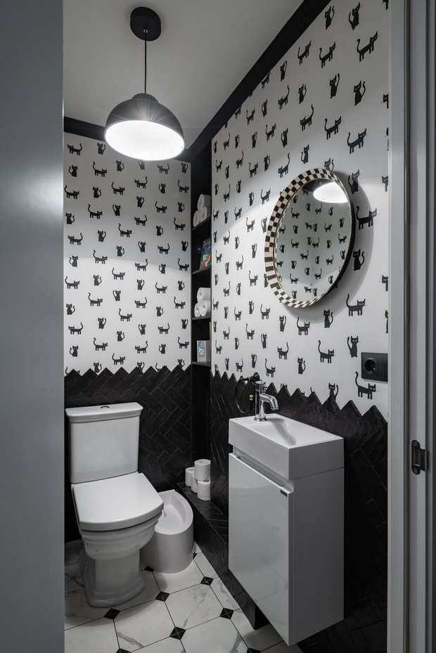 Дизайнер Татьяна Архипова создавала интерьер для себя и семьи: в квартире 65 м² предусмотрены два санузла — один с черными стенами и потолком, второй с яркими графичными обоями с принтом кошек. В санузле с обоями установили автоматический лоток, который не нарушает эстетику. Белый корпус устройства гармонирует с белой сантехникой и светлым фоном обоев, а черно-белая плитка на полу поддерживает общую цветовую гамму. Автоматический лоток — практичное решение для небольшого санузла: устройство самостоятельно очищается, что экономит время и сохраняет свежесть в помещении.