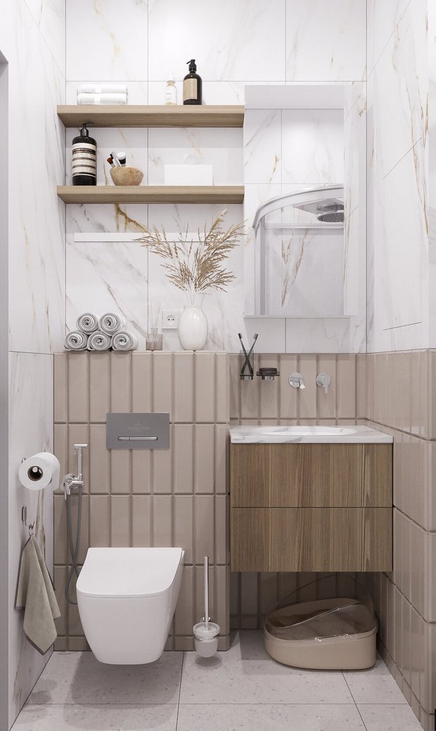 Дизайнеры студии 3DDesign обустраивали квартиру для семьи с двумя детьми, двумя кошками и собакой. На 83 м² нужно было создать кухню-гостиную, три спальни и предусмотреть места для питомцев. В гостевом санузле под подвесной тумбой разместили лоток для кошек. Тумба из дерева на подвесном креплении оставляет пространство под собой свободным — туда помещается закрытый лоток в бежевом цвете. Снаружи санузел выглядит аккуратно, а кошки имеют постоянный доступ к своей зоне.