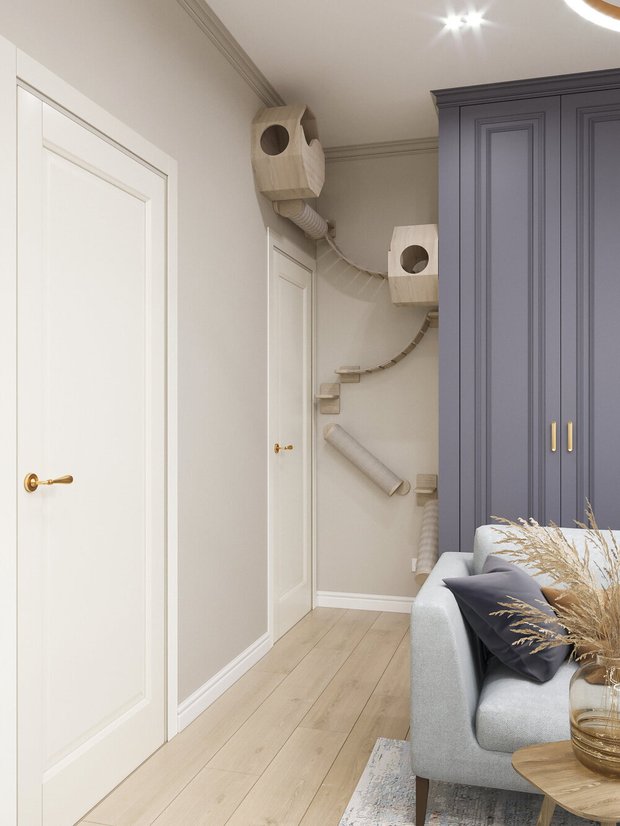 Дизайнер Влада Николаева обустраивала двушку 61 м² для женщины, которая переезжает из деревни в город с двумя кошками. В гостиной зону для питомцев интегрировали в общую систему хранения. За диваном расположили большую зону хранения с подвесной полкой, которая визуально скрывает умный лоток. Рядом разместили просторный игровой комплекс — кошки общительные и любят проводить время с хозяйкой, располагаясь на лежанках во время просмотра телевизора. Лоток скрыт от глаз, но остается доступным для кошек.