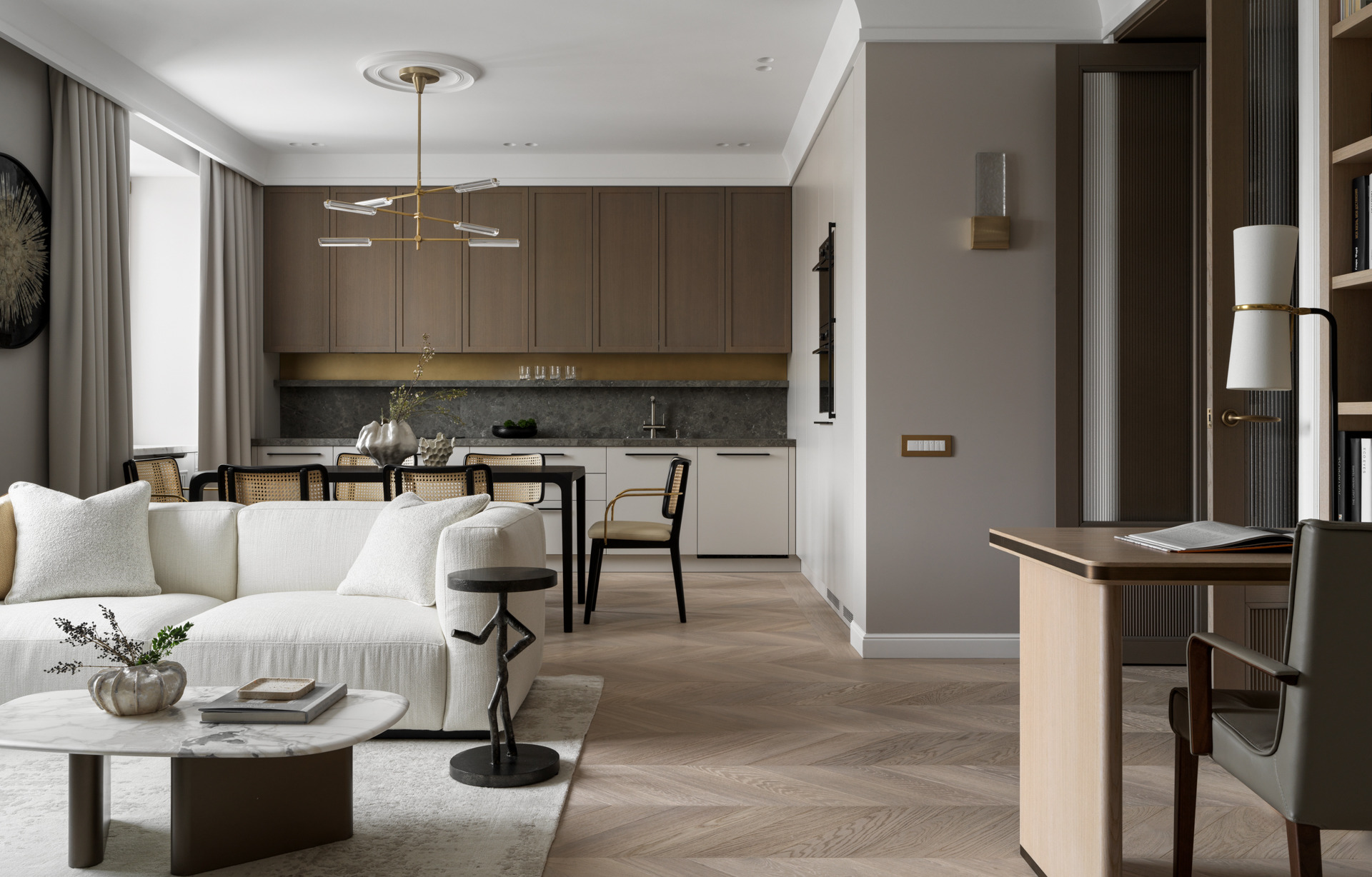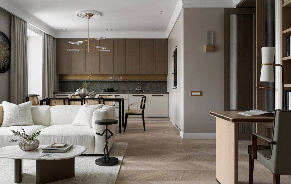 В квартире сделали перепланировку, но основные зоны оставили на своих местах. Кухню присоединили, убрав перегородку — получилось просторное кухонно-столовое пространство, совмещенное с гостиной. В нем обособлен, но открыт мини-кабинет с рабочим местом и стеллажом. Получился интересный вариант планировки с парадным заходом в спальню, что добавляет основательности и шика интерьеру.