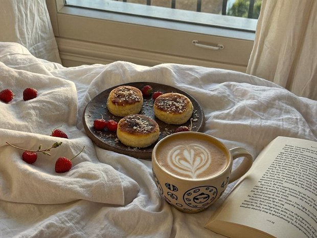 Капучино с кокосовым молоком и запеченные сырники с ягодами