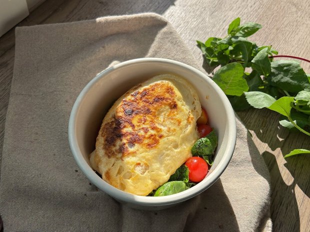 - Готово: омлет получается пышным, с золотистой корочкой.