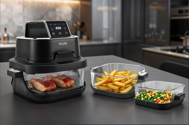 Аэрогриль FELFRI FF-AF-09 с двумя стеклянными чашами подойдет для тех, кто любит контролировать процесс и эстетику. Главное преимущество — вы видите приготовление блюда в реальном времени через прозрачное боросиликатное стекло, не открывая крышку. Это важно для выпечки: можно отследить момент, когда маффины дошли до нужной степени готовности, и вовремя их достать.