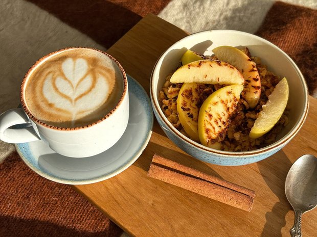 Латте с миндальным молоком и запеченная овсянка с яблоком