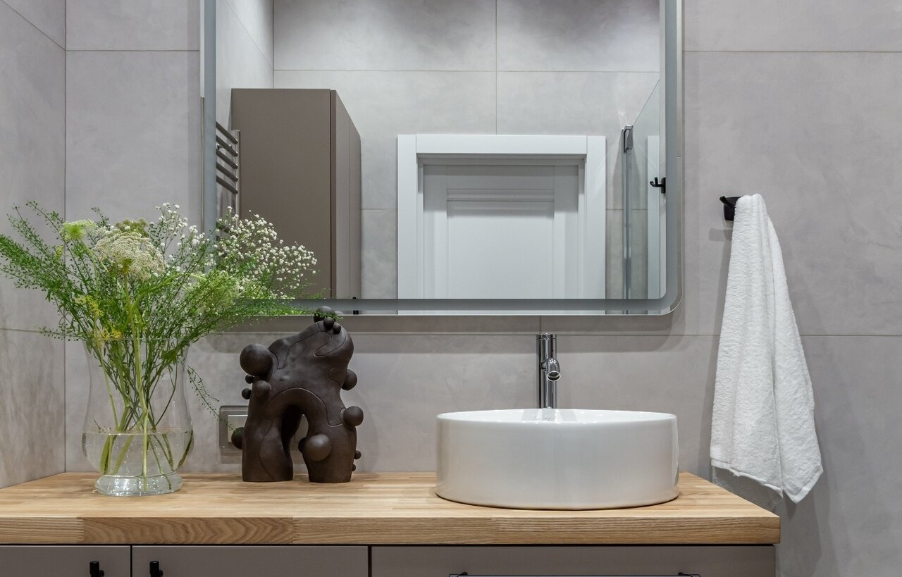Крупная плитка (30 на 60 см и больше) визуально увеличивает маленькое помещение лучше, чем мелкая мозаика. Светлые тона стен и пола создают ощущение воздуха. Одинаковая плитка на полу и стенах стирает границу между поверхностями и зрительно расширяет пространство.