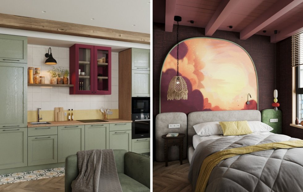 Дизайнер Никита Кожуховский разработал дизайн-проект для молодой семейной пары. Заказчики выразили предпочтение к зеленому и винному цветам, категорически отказавшись от серого интерьера. Основным требованием было создание пространства с индивидуальным стилем и настроением, которое бы при этом оставалось уютным.