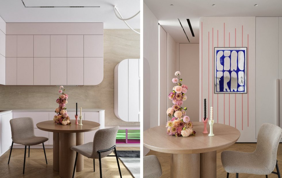 Кухня выполнена в лаконичном стиле с округлыми формами и спокойными фасадами, чтобы она гармонично сливалась с гостиной, а не противопоставлялась ей. Кухонный гарнитур изготовлен на заказ для идеального соответствия общей концепции интерьера. Закругленные углы и мягкие линии добавляют пространству уютной визуальной легкости. Нежно-розовый оттенок кухни поддерживает общую цветовую палитру, делая пространство более теплым и целостным. Все бытовые приборы аккуратно интегрированы и скрыты за фасадами, что позволяет кухне выглядеть цельной, лаконичной и не перегруженной деталями.