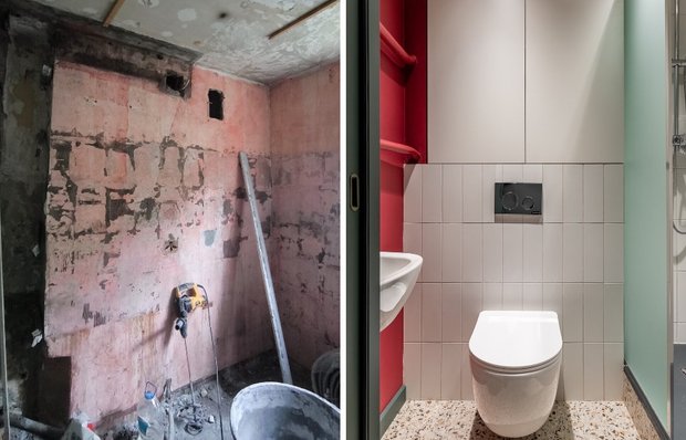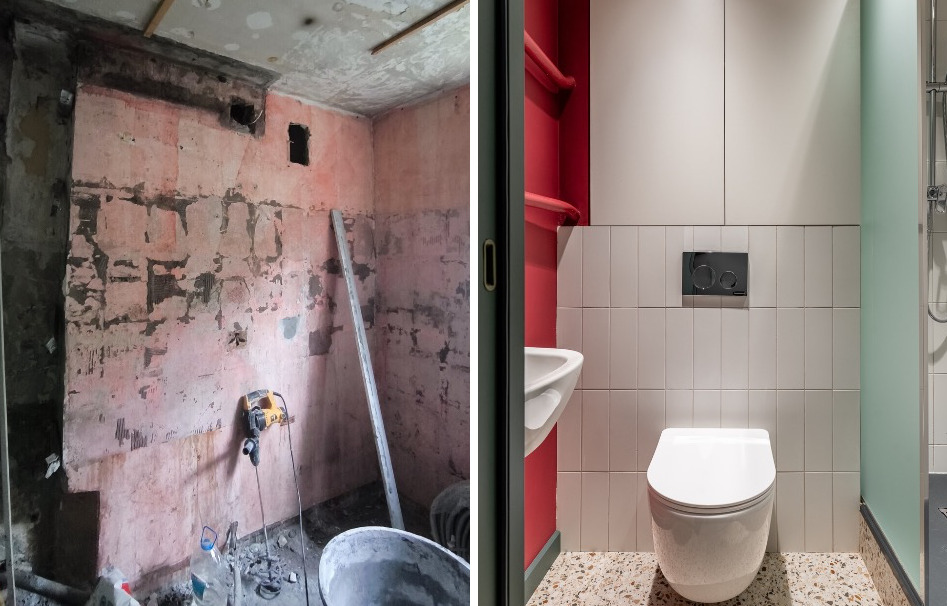 Стены в санузле разделены на две зоны: брусничная краска на одной стене и белая квадратная плитка, уложенная вертикально, на остальных. Пол — тот же терраццо, что в кухне и прихожей, единое покрытие визуально увеличивает маленькое пространство. Плинтус изумрудный — такой же, как и двери по всей квартире.
