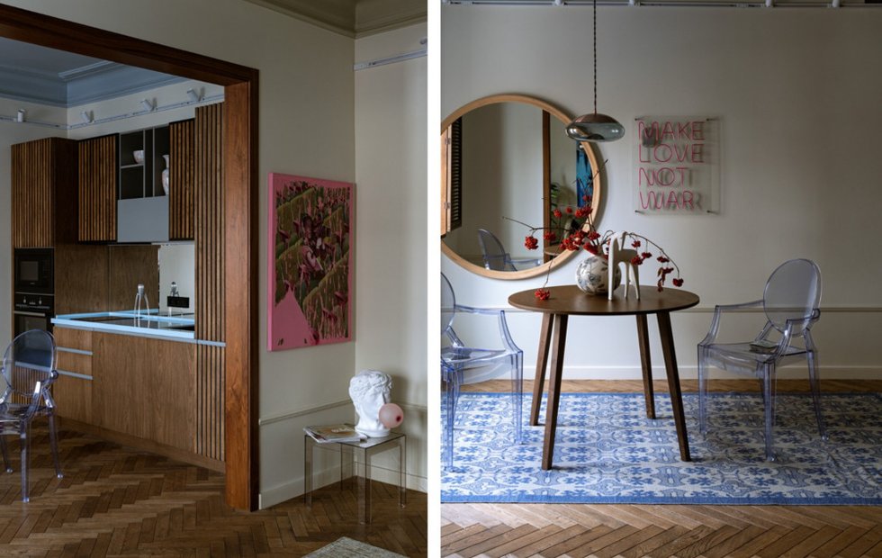 Современные элементы интерьера гармонично сочетаются с бережным отношением к истории. Стены окрашены в нейтральный теплый оттенок, близкий к оригинальным цветам, которые использовались в квартирах той эпохи. Настроение пространства создают цветные потолки — в каждой комнате уникального оттенка. Основной акцент гостиной — синяя живопись художника Романа Белова, от которой строилась дальнейшая палитра интерьера в мягких, природных тонах.