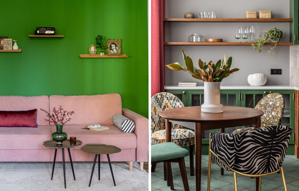 Хорошо с задачей справляются насыщенные глубокие оттенки — зеленый, синий, бордовый: они дают максимальный эффект даже в небольшом количестве. Пастельные голубой, розовый и оливковый добавляют мягкости без риска перегрузить пространство. Достаточно одного цветового решения (акцентной стены, цветного гарнитура или насыщенного текстиля), чтобы простой интерьер начал выглядеть продуманно.