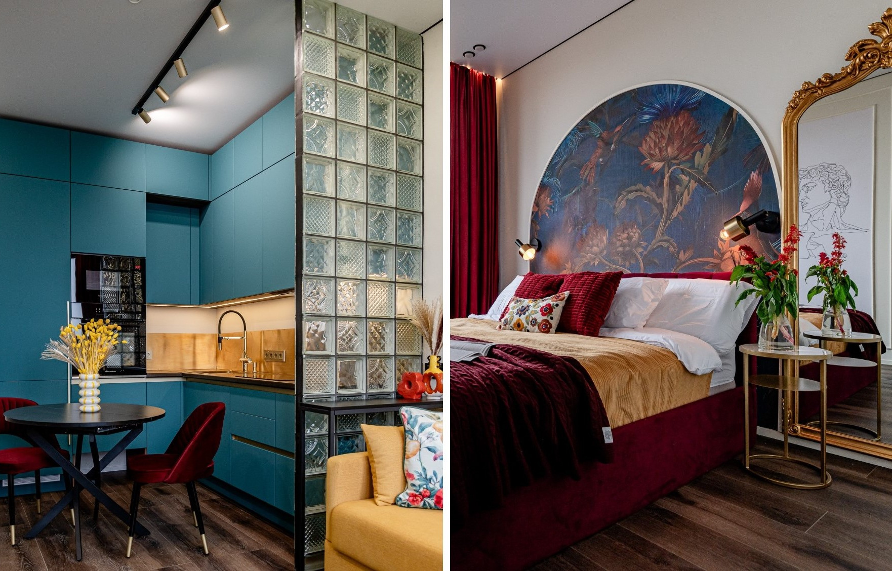 Сама кухня — это смелый художественный жест. Насыщенные бирюзовые фасады, золотая мойка и смеситель, латунный фартук превращают функциональную зону в произведение искусства. Этот акцент поддержан бордовыми шторами и желтым диваном, создавая живую, запоминающуюся палитру. Даже мисочки для кошек нашли свое продуманное место в нижней части кухонного гарнитура, не создавая помех и органично вписываясь в общую картину.