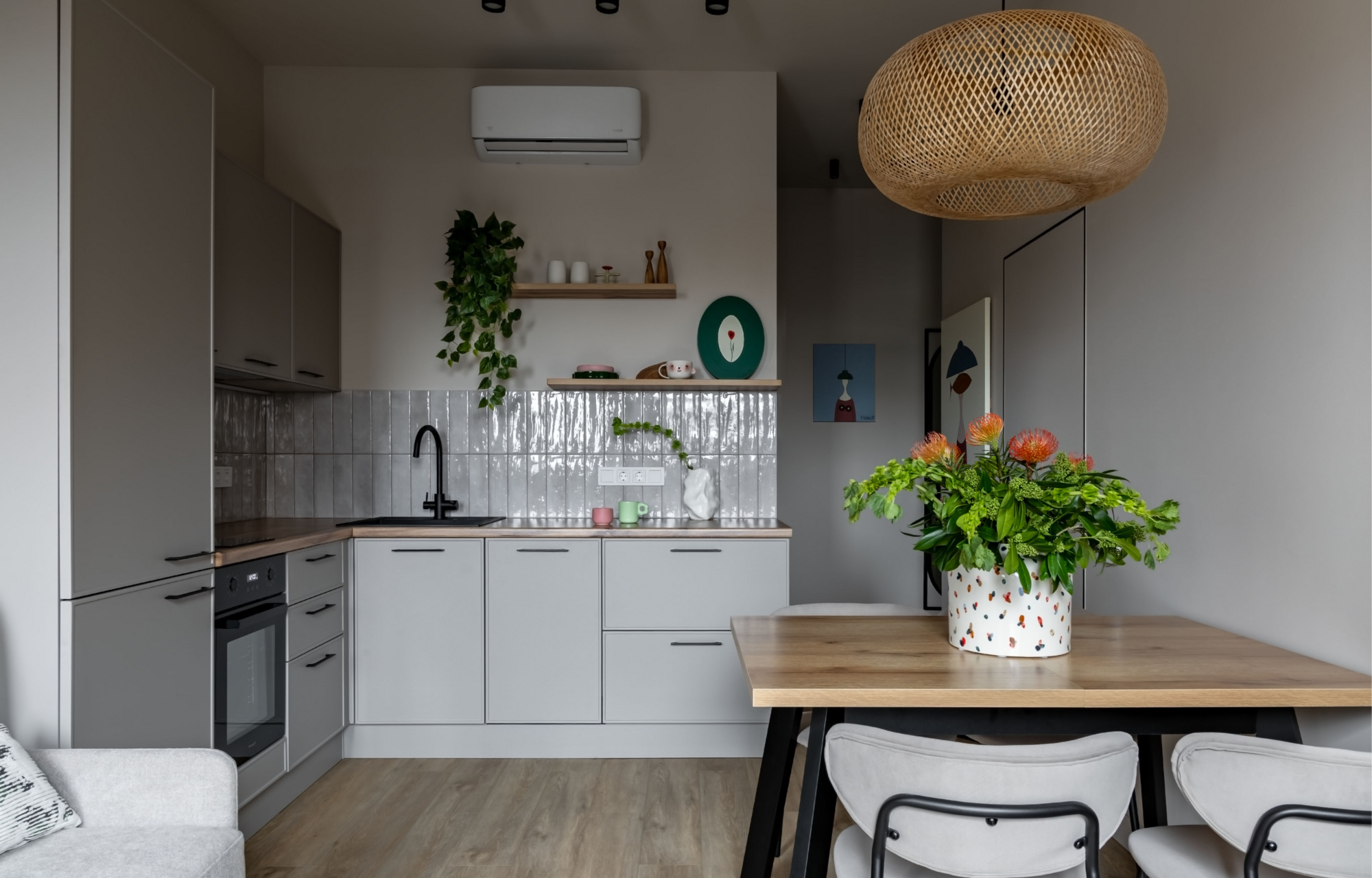 Кухонный гарнитур изготовлен на заказ с фасадами, цвет которых максимально приближен к оттенку стен. Это решение позволило создать цельный и визуально легкий объем. Для оптимизации бюджета было решено отказаться от высоких шкафов до потолка и сократить их количество. Часть навесных секций заменили открытыми полками с интегрированной подсветкой, что сделало пространство более воздушным и дало удобный доступ к часто используемым вещам.