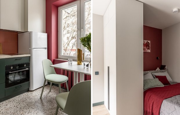 Дизайнер Лидия Напреенко из студии «Мимоза» работала над однушкой 19 м² в хрущевке: квартира предназначалась под аренду и требовала полноценного набора — спальная зона, рабочее место, вся техника и достаточно хранения. Дом строился для одиноких деятелей культуры, поэтому метражи здесь особенно компактные — больше 30 м² нет ни у кого. Чтобы вместить все необходимое, пришлось перенести дверной проем и продумать каждый сантиметр.