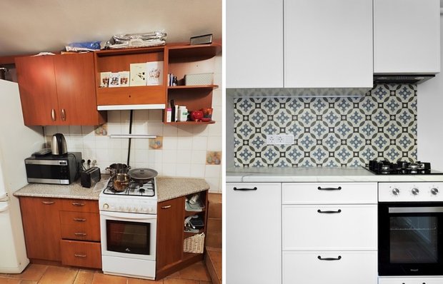 На фото до мы видим темный гарнитур из ДСП, белая плитка с наивными рисунками и открытые полки с вещами вразнобой.