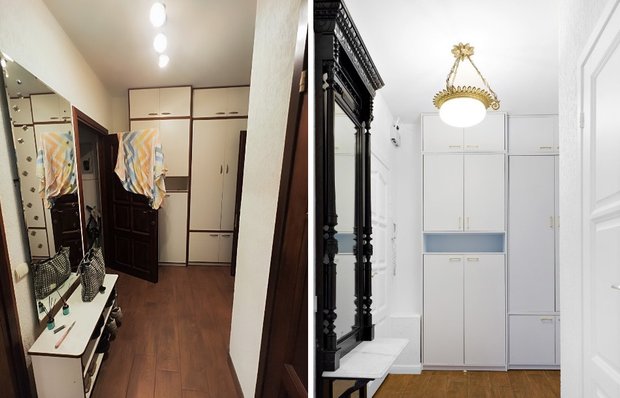 Дизайнеры Ксения Левина и Татьяна Бельтова из студии «50 оттенков интерьера» работали над двушкой 55 м² в доме 1850 года в историческом центре Петербурга. Прихожая здесь Г-образная, с невысокими потолками и плохим освещением — до ремонта темные двери и разномастная мебель делали ее еще теснее. На фото до: бежево-коричневый шкаф с обводкой, обычное зеркало, обычная полка для обуви — все функциональное и ничего запоминающегося.