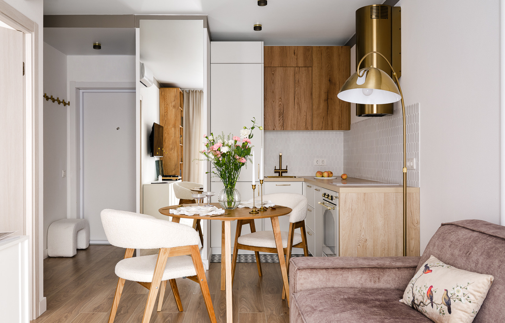 Важным условием для кухни, как помещения под аренду, была практичность, поэтому клиентка хотела использовать на полу керамогранит. Однако разделять небольшое пространство кухни-гостиной напольной плиткой было бы ошибкой — это визуально уменьшило бы квартиру. Решение пришло само: плиткой выложили только зону активной готовки. Это оказалось практично и идеально поддержало французскую тему.