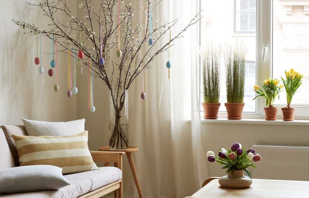 Срезанные ветки вербы, березы или любого другого дерева в высокой вазе — самый простой и при этом эффектный пасхальный декор. На ветки вешают небольшие расписные яйца на атласных лентах: они красиво качаются при движении воздуха.