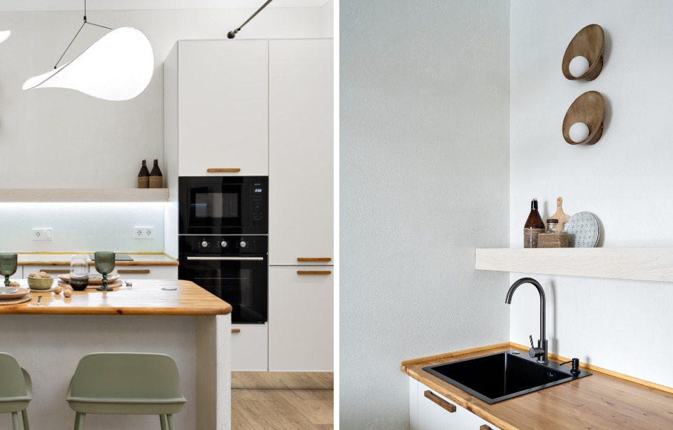 Центр всего — остров с деревянной столешницей и основанием, отделанным штукатуркой под мазанку. Фактура грубоватая, и именно это контрастирует с белыми фасадами и создает нужную глубину. С одной стороны острова три мятных барных стула, с другой — закрытый шкафчик для сыпучих продуктов. Над островом две крупные асимметричные люстры на черных тросах: они двигаются при открытии балкона и добавляют пространству динамику.