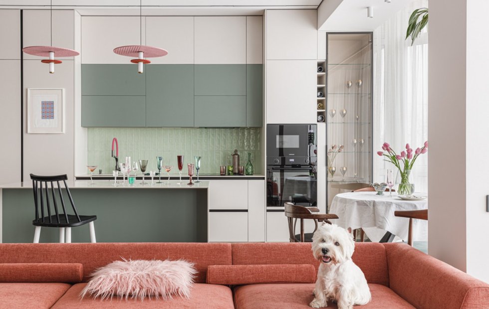 На первом этаже, напротив, доминируют предпочтения заказчика, выраженные в четких линиях и лаконичных формах. Однако и здесь учтены интересы хозяйки, особенно на кухне — основном месте ее времяпрепровождения. Баланс достигнут через объединение строгой геометрии с акцентными цветами, создающее целостную и функциональную среду для всей семьи.