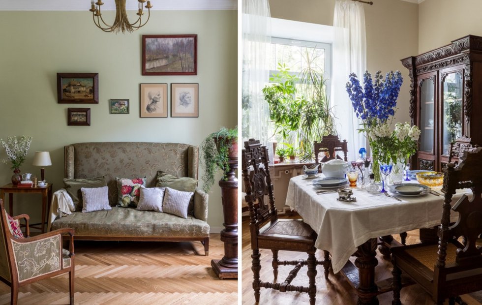 Эта квартира — результат труда многих поколений творческой семьи. Интерьер представляет собой смелый микс антиквариата, мебели из Икеа, итальянских шкафов, картин, написанных как родственниками, так и друзьями семьи. Кухонный стол, например, стал свидетелем взросления не менее трех поколений и любимым местом игр для всех детей. Люстра в гостиной куплена на распродаже в сельхозе на станции Кратово. Мебель в кабинете — стол и кровать — осталась от бабушки. Особую гордость у Дарьи вызывает стеллаж для книг, собранный из половой доски и балясин для лестницы и выкрашенный в цвет стены. Этот стеллаж стал «фирменным» решением, аналогичный имеется и в мастерской дизайнера.