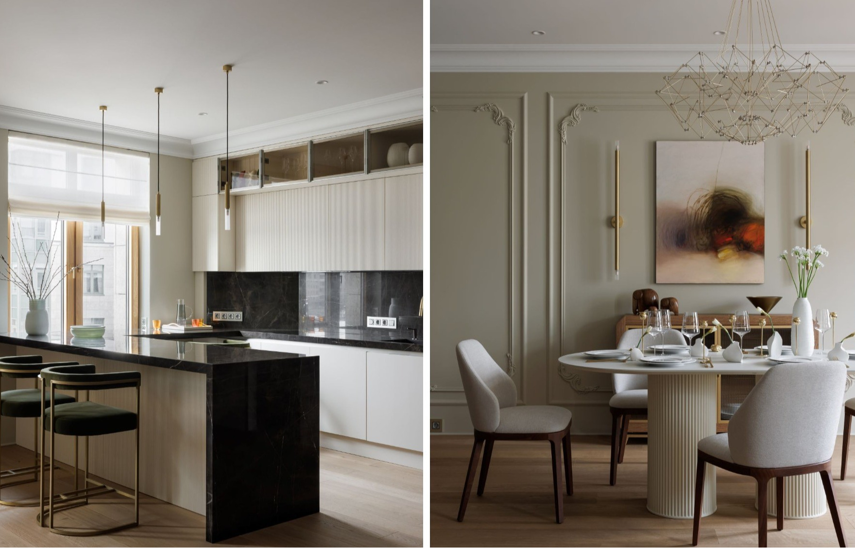 Стилистика интерьера характеризуется классической базой, дополненной современной мебелью. Чтобы избежать перегруженности, оснащение было выбрано современное и технологичное: корпусная мебель в гостиной, встроенные двери скрытого монтажа, трековые светильники. Диван обладает возможностью регулировки глубины сиденья, что осуществляется либо электрически, путем нажатия кнопок, либо механически, путем опускания и поднятия спинки. Такие функциональные элементы подчеркивают смешение стилей, делая интерьер глубоко проработанным и удобным в повседневном использовании.